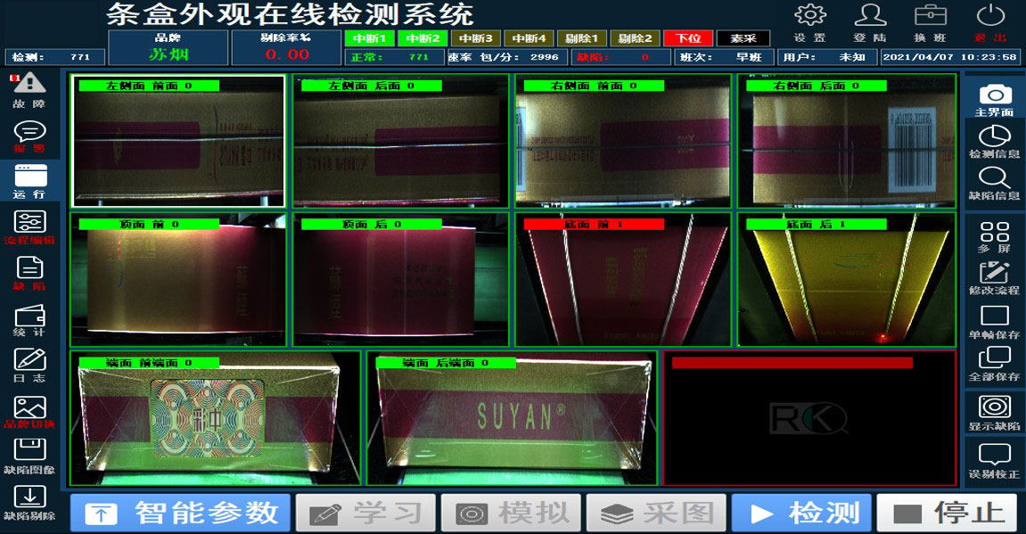 采用(yòng)新型機(jī)器(qì)視(shì)覺+偏振技(jì)術(shù)+深度學習(xí)功能(néng),能(néng)夠 檢測條盒五個(gè)面的(de)外(wài)觀質量缺陷。克服了(le)高(gāo)反光(guāng)材質帶來(lái)的(de✔)障礙,完美(měi)解決了(le)條盒在玻璃紙(zhǐ)上(shàng)的(de)反光(guāng)問(wèn)題。