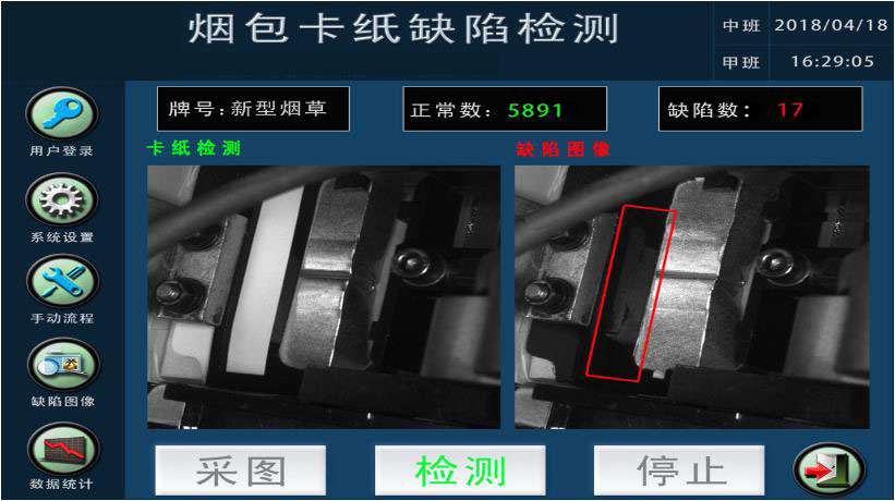 ✤當卡紙(zhǐ)到(dào)達位置後,通(tōng)過彩色相(xiàng)機(jī),獲得(de)卡紙(zhǐ)的(de)彩色圖像。安裝于工(gōng)控機(jī)↓的(de)ICS軟件(jiàn)對(duì)獲得(de)圖像進行(xíng)機(jī)器(qì)視(shì)覺分(fēn)析,判斷圖像是(shì)否有(yǒu)質量缺陷,如(rú)果有(yǒu)♠質量缺陷,則将剔除信号發送給剔除機(jī)構,對(duì)設備進行(xíng)剔除,并将缺陷圖箱保存。