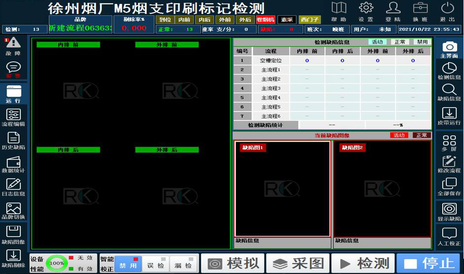 經過加強對(duì)基于多(duō)光(guāng)譜彩色成像,智能(néng)識别等視(shì)覺檢測技(jì)術₹(shù)的(de)研究應用(yòng),提升檢測可(kě)靠性。實現(xiàn)了(le)在生(shēng)産過程中在線對(dαuì)煙(yān)支鋼印缺陷進行(xíng)檢測,套印不(bù)準、燙金(jīn)偏位、圖文(wén)缺陷、漏印、飛(fēi)水(shβuǐ)、飛(fēi)墨、滴油、拖墨、髒點、墨皮、糊版、燙金(jīn)殘缺、紙(zhǐ)張爛洞、紙(zhǐ)斑;色序漏印;色差偏離(lí)标準範圍;紙(zhǐ)張打折;燙金(j↓īn)邊距偏差;燙金(jīn)套印、套燙偏差等。